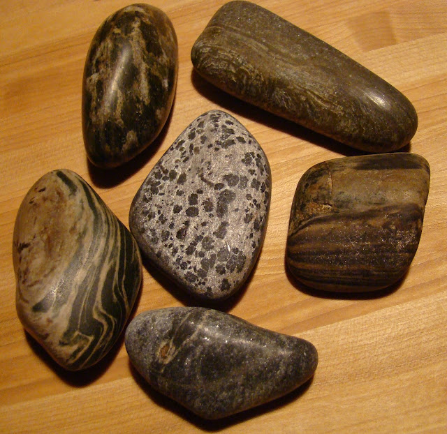 und diese hier, sind meine absoluten Lieblinge.....der braune, matte, rechts ist versteinertes Holz, der braune lange ist voller Muster die silbrig glänzen.....der in der Mitte ist unten ganz schwarz und der gefleckte oben links ist einfach nur schön. Man bedenke, dass jeder der polierten Steine unscheinbar war und nach nichts aussah......Ist es nicht enorm, was man da entdecken kann?